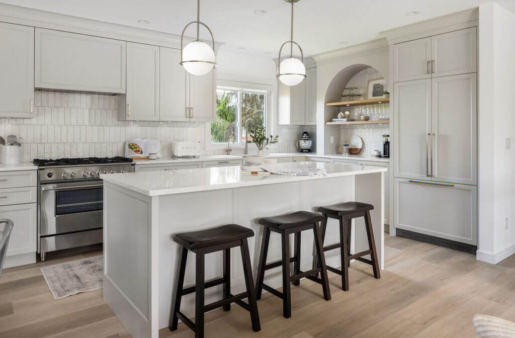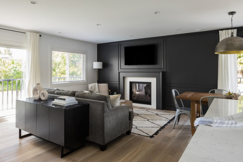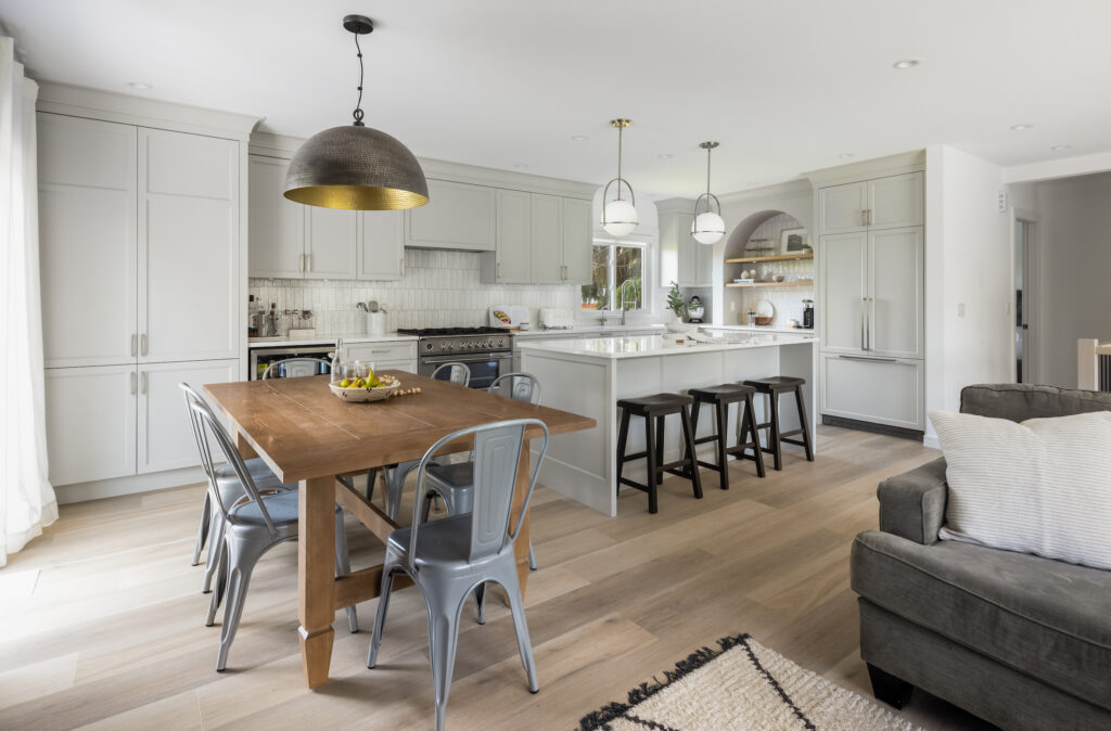 The kitchen features full-height, soft-grey shaker kitchen-cabinets with integrated appliances, white veined quartz-countertop, glossy vertical offset backsplash-tile, and a hammered-metal dining pendant-light, all of which add texture and dimension. The wood-burning fireplace has been replaced with a Direct-vent gas-fireplace, and the hazardous stairs have been rebuilt to meet code. Other features of the home include EnergyStar-rated Vinyl Tek windows and patio doors, high-efficiency Fisher Paykel appliances, antimicrobial quartz-countertops, filtered instant hot/cold water-dispenser, and dual-flush comfort-height toilets. Overall, the renovation has achieved an outstanding transformation, providing the family with a safe, functional, and aesthetically pleasing home.