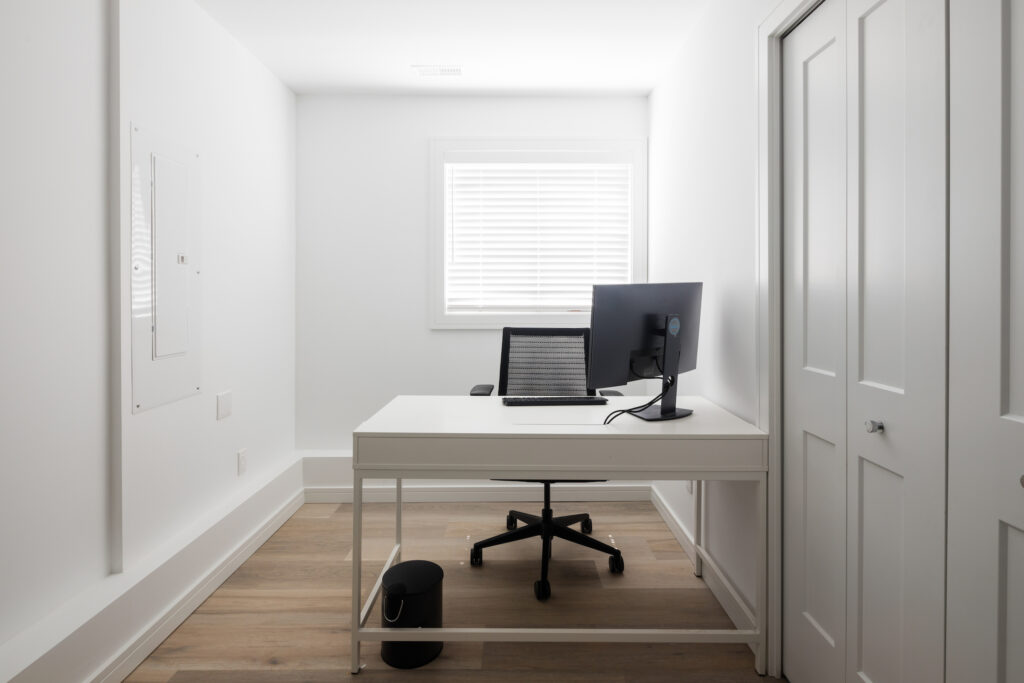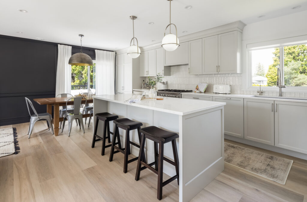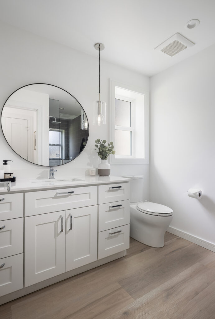 Moreover, the home boasts unique arched millwork around the coffee-station and molding application on the living and dining feature-wall, which not only looks custom but also makes a dramatic statement. The bright white color-palette with bold black accents creates a fresh and modern aesthetic, while the White Ash luxury vinyl-plank flooring throughout looks just like hardwood. The white-oak black-metal staircase perfectly compliments the vinyl-flooring and transforms the space.