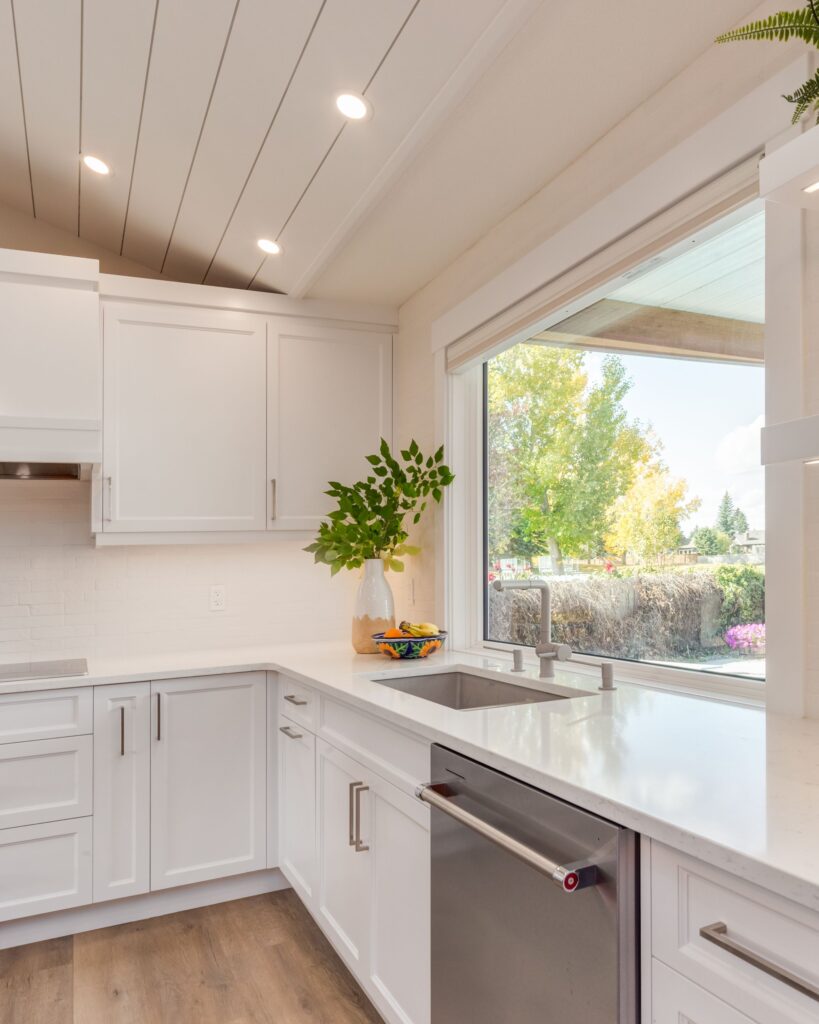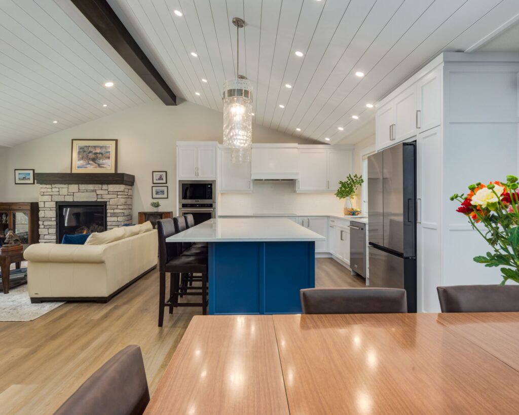 The renovation project is a masterful blend of traditional style and modern functionality, epitomized by its distinctive design fusion. As soon as you enter, the transformation is striking, with the removal of flat dropped ceilings giving way to a breathtaking open concept featuring expansive, shiplap-clad vaulted ceilings. This dramatic change required the rebuilding of all roof trusses from the inside, but the result is a spacious and inviting atmosphere that enhances the home’s overall appeal. At the center of this transformation is a striking blue island, serving as a bold focal point that adds a unique design element to the space. The introduction of new windows and patio doors floods the area with natural light, maximizing brightness and creating a more inviting environment. This increase in natural daylight not only enhances the space aesthetically but also boosts energy efficiency, reducing the need for artificial lighting. Complementing the traditional aesthetic, modern fittings and appliances have been seamlessly integrated, offering convenience and functionality. The renovation harmoniously connects with the rest of the home, ensuring a cohesive and holistic living space that not only meets but exceeds the homeowner’s expectations, significantly elevating overall livability.