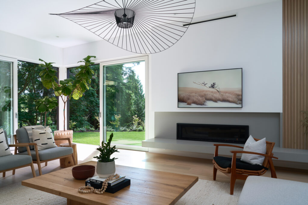 Nestled in the woods, this private oasis is the perfect family home. The clients wanted plenty of space for family activities and a big open floor plan on the main floor to entertain their guests. All of the main spaces have triple-glazed corner windows that open towards the south-west facing backyard, for natural lighting, ventilation, and views.