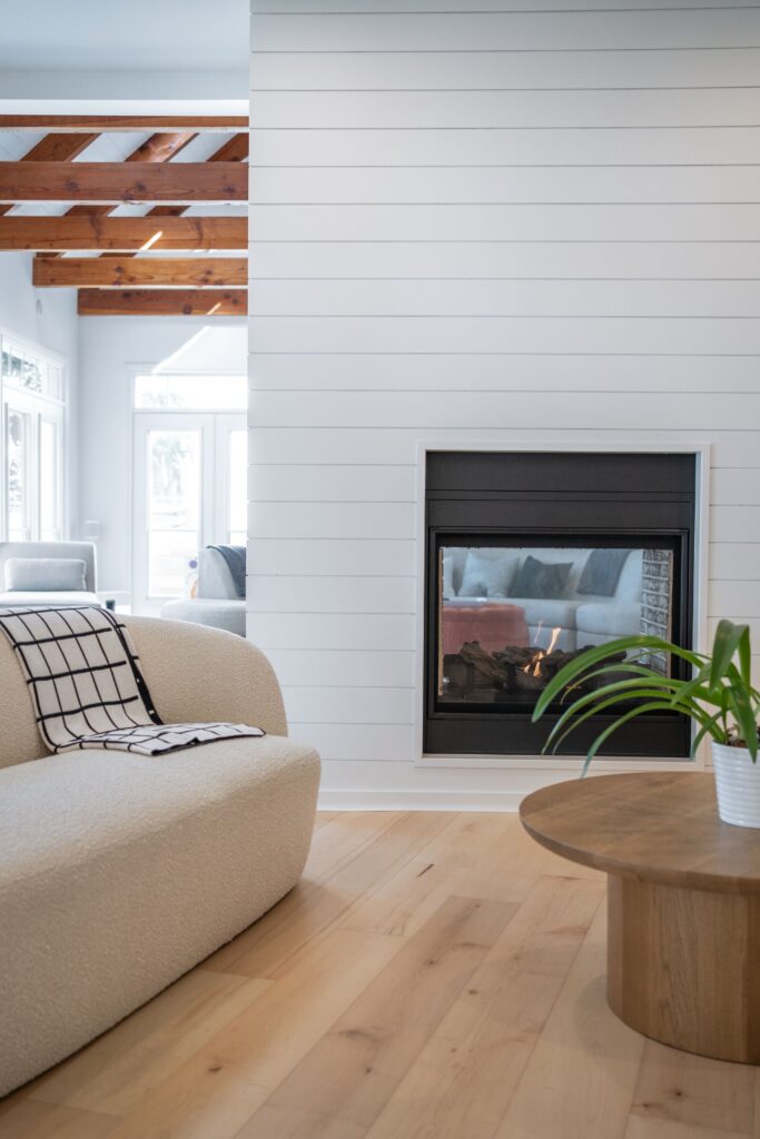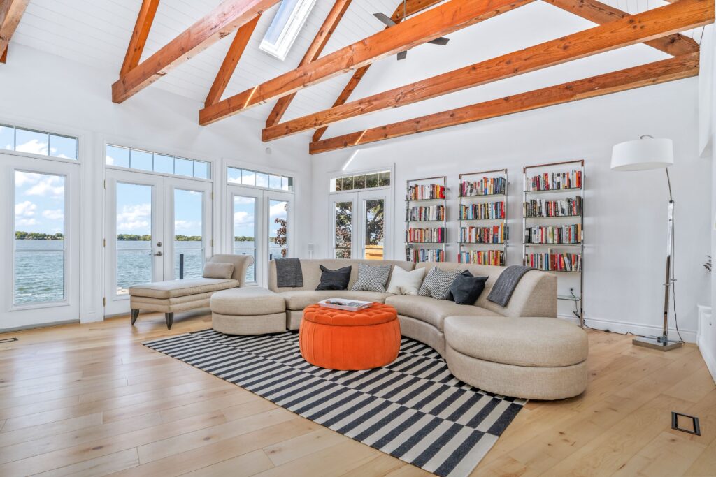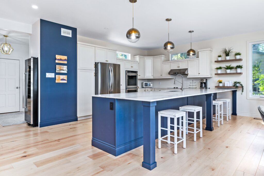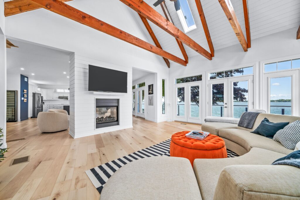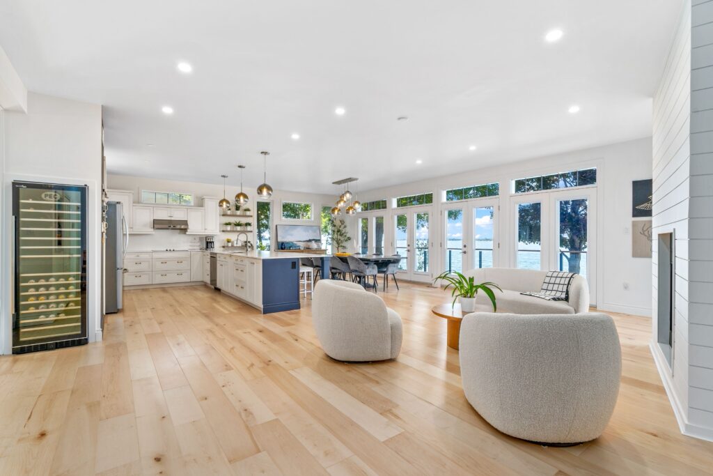 Today, this home offers a luxurious getaway ambiance, reminiscent of a resort. The expansive main living area, now featuring an open-concept kitchen, lounge zone, and a library with cozy reading nooks, has become a prime destination. The finishes are contemporary, complemented by natural hues inspired by the setting, including blues and woodsy tones. Enhancements to the deck further expand the living space, connecting the entire home into a true oasis, ideal for this family’s love of entertaining and spending quality time together. The newly designed kitchen boasts a massive 54-inch-wide countertop with an almost 30-inch overhang. Preserving the fireplace serves as a centerpiece, adding charm to the space. The floor plan has been completely redefined to create distinguished spaces that celebrate every aspect of their beloved living areas.