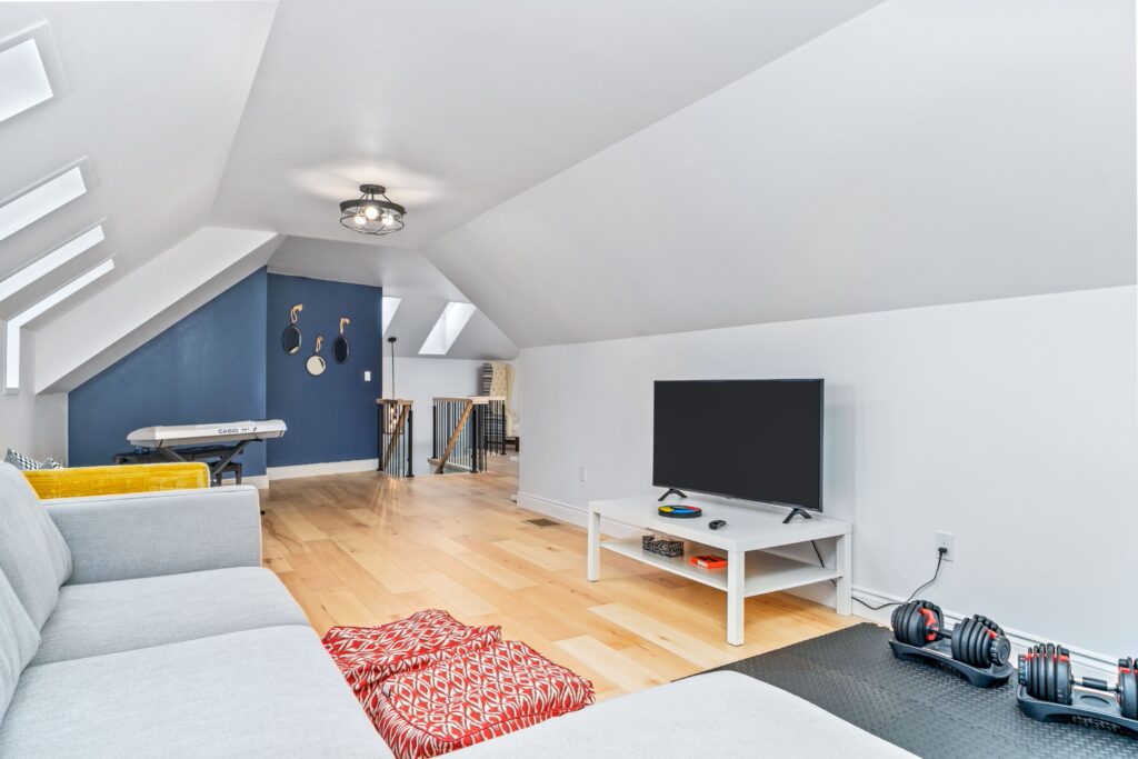 Significant modifications in this project included the transformation of the upstairs kitchen into a bedroom and lounge area, along with the addition of a new bathroom. A new kitchen design was implemented on the main floor, featuring modern countertops while retaining the existing cabinets. Additionally, custom stairs and railings were installed, and a spacious, airy family/living room was incorporated into the main area. Great attention was given to the windows, ensuring that the design allowed for plenty of natural light to create a seamless blend between indoor and outdoor spaces.