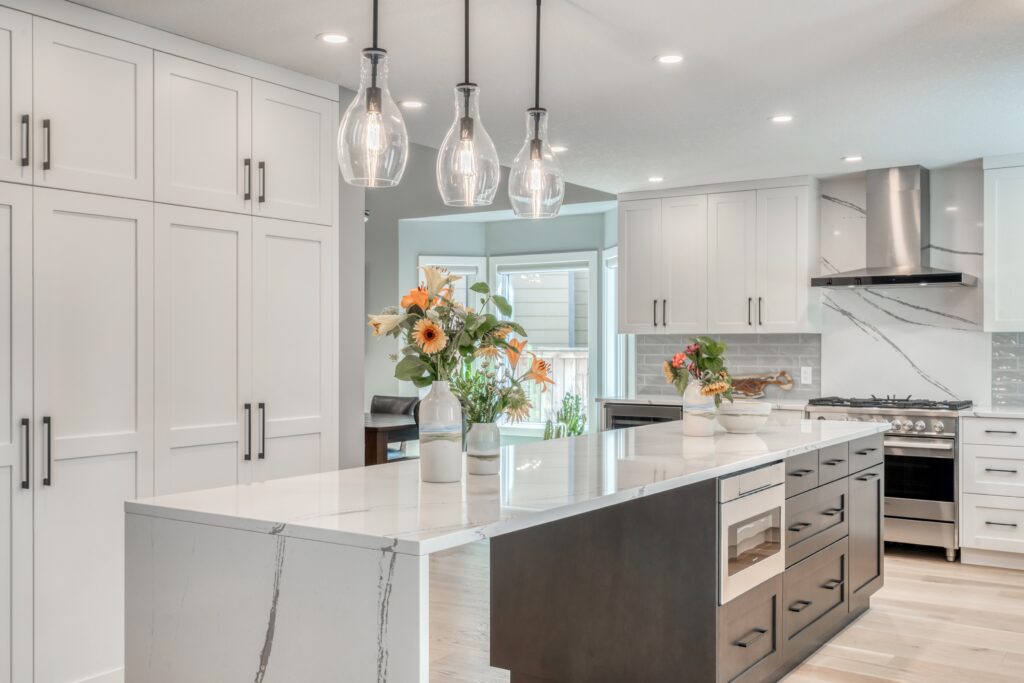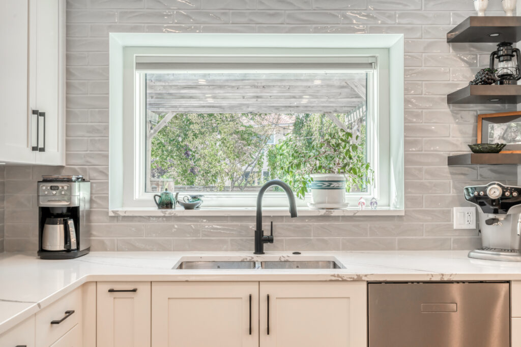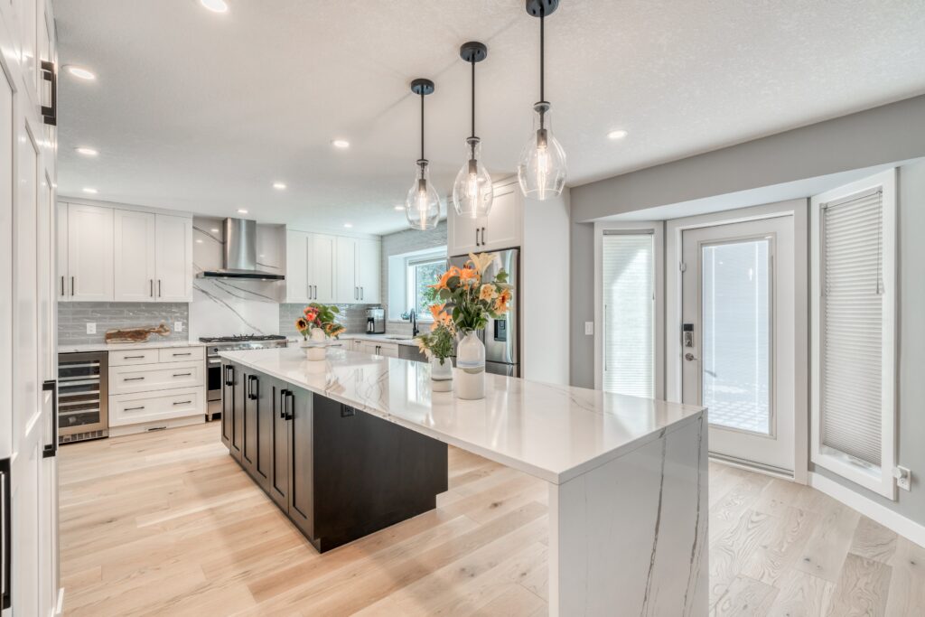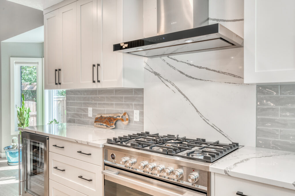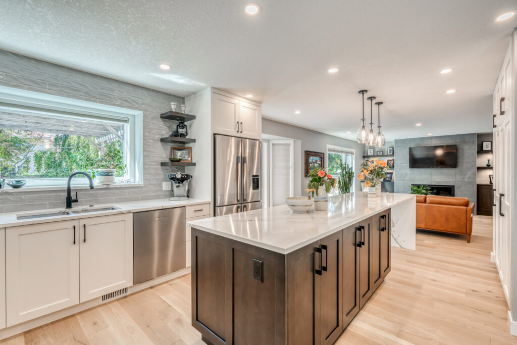 Re-inventing the kitchen and deleting structural wall separating dining room allows for perfect entertaining as there is now space to accommodate more people. The kitchen now boasts a stunning custom stone, open-seat waterfall island, with matching stone backsplash for the fluted hood fan, completing the uniform look throughout. The bright kitchen window is surrounding by a textured wavy neutral tiled backsplash, creating lovely visual interest and an inviting experience.