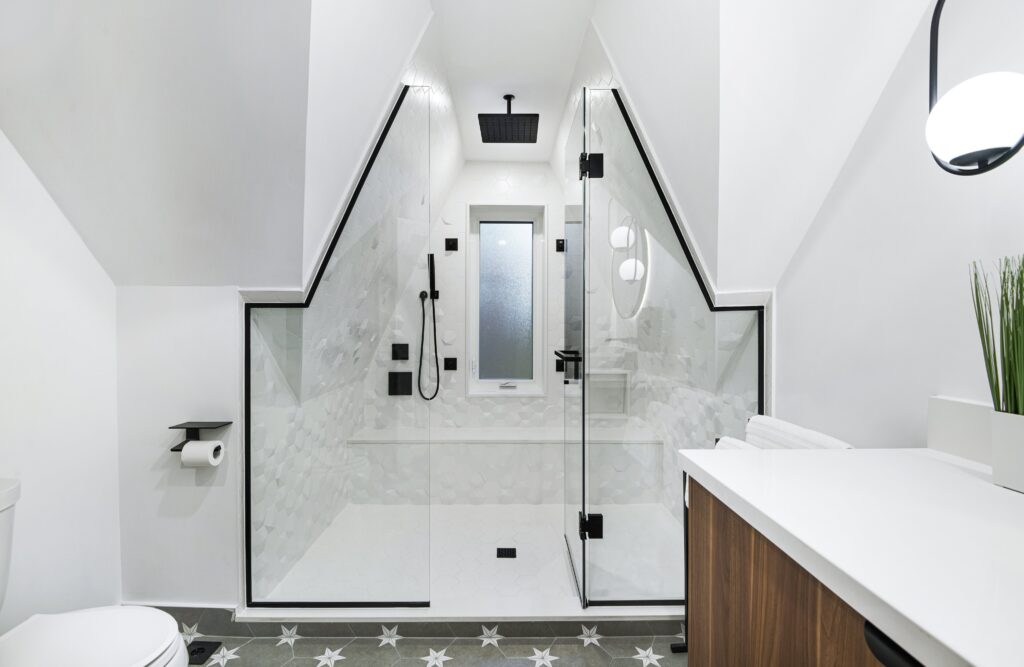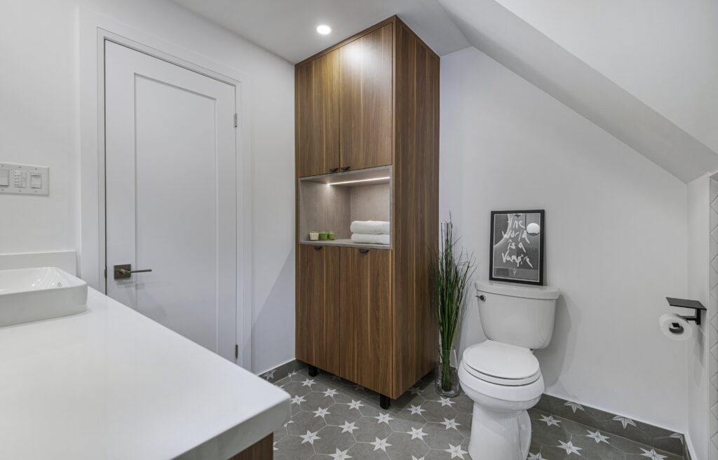 We removed the unused tub by the window and created a spacious walk-in shower instead with a large contemporary rain showerhead and a bench. The window provides lots of natural light, taking the showering experience to a whole other level. The uneven angled walls of the attic roof were updated with a neat designer’s trick – the 3D tile hides all the imperfections. A new custom-made vanity with drawers and a matching large storage cabinet were installed to provide plenty of functional storage.