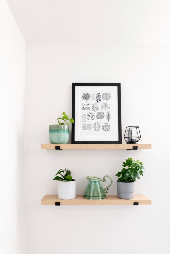 A classic black-and-white color scheme was displayed in a playful manner throughout the new bathroom. The floor was clad in a polka-dotted, mosaic tile which was echoed by the black niche centering the subway tile tub surround. Oak, seen throughout the rest of the house, was used to frame the large vanity mirror and add some much-needed storage in the form of open shelving. Chrome fixtures match those seen in the kitchen and another main-floor bathroom. White shaker-style millwork and quartz countertops kept the clean look consistent.