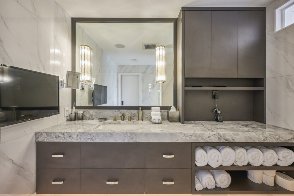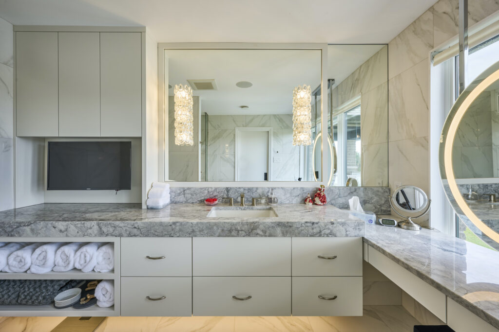 Her space mirrors the layout, done in shades of white. Large glazing floods the room with natural light and a sense of serenity throughout the entire space, reflecting off the Carrara-inspired porcelain tile. On this side, a ceiling-hung LED mirror ensures the best dressing light possible without obscuring the windows and the peaceful views of the Rideau River. Super White natural stone counters add warmth to this elegant, monochromatic room.