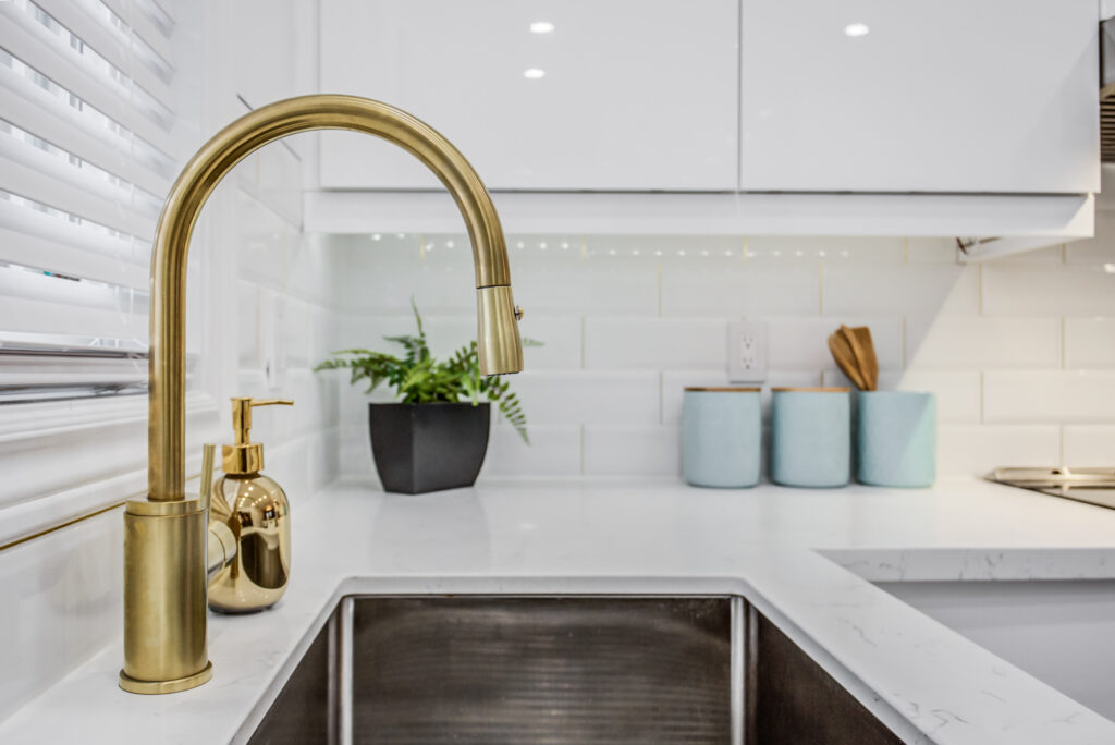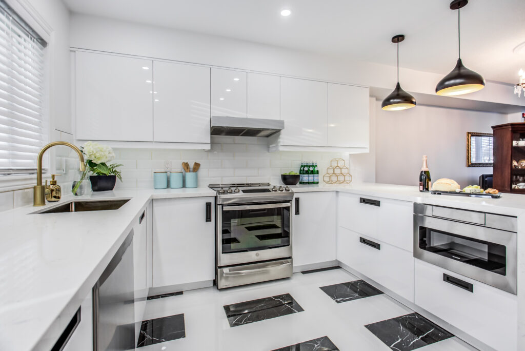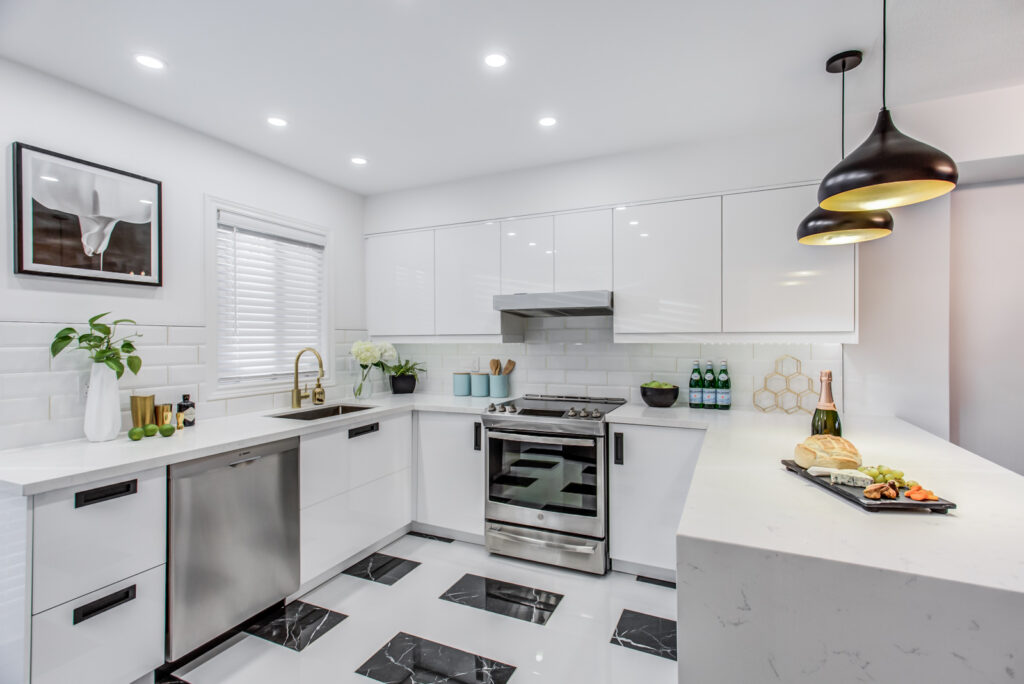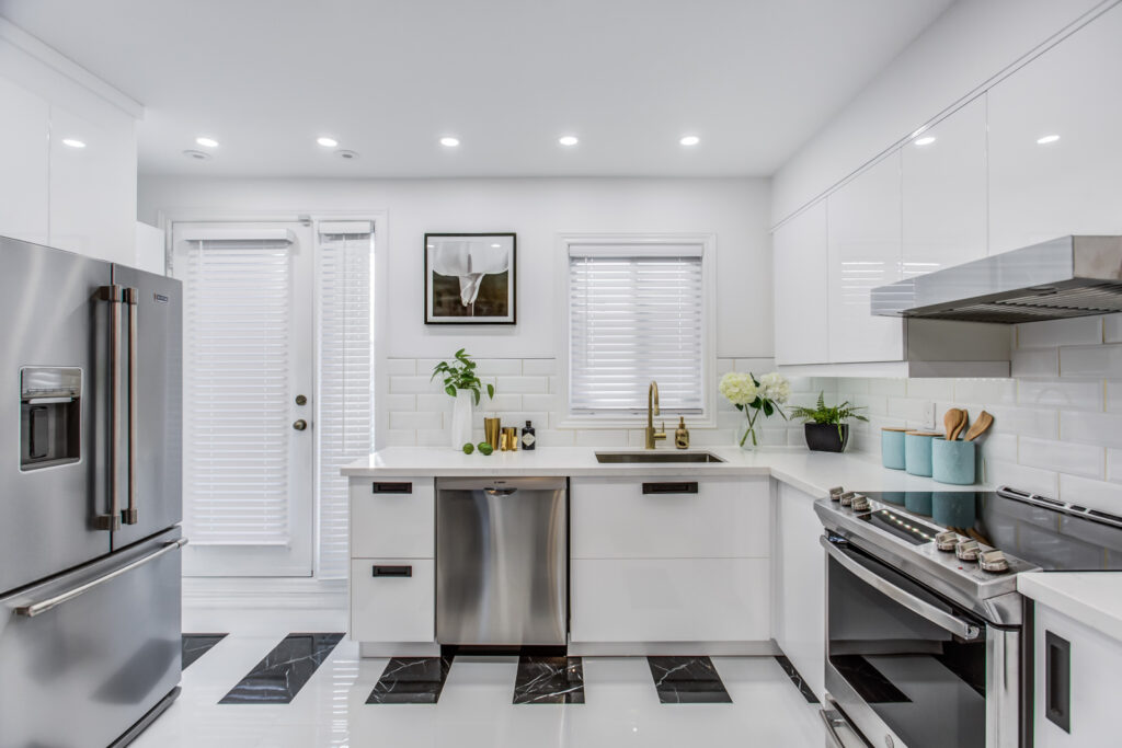 Carried the monochromatic theme from the bathroom into the kitchen with white high gloss cabinetry with aquartz countertop. The new floor is a pattern of white and nero-marquina tiles accented with brass edgers. The backsplash bevelled white subway tiles are adorned with vertical brass edgers as well.