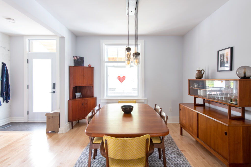 Preserved overall footprint of the house and the heritage look from street view. Adding second-storey addition at rear to provide “free-floating” master bedroom, meeting homeowners’ dream of a “treehouse”, sitting on 2 15’ helical piles with large awning windows to enhance views Exterior finishing on addition is distinct but design elements allow it to blend, with similar roof pitch and subordinate scale. Custom structural brackets and posts avoid cross bracing that would have obstructed view New walk-in master closet has 14” sun tunnel. Uncovered interior barnboard sheathing in stairway. Preserved along with as much of the mouldings and trim as possible to ensure historic nature of house respected. Neutral grey colours on walls work with client’s relaxed style. Colour used throughout to add personality, balanced with warm woods and comfortable upholstery. Flooring consistent throughout in terms of direction and materials. Pale wood flooring finish helps to reflect daylight.