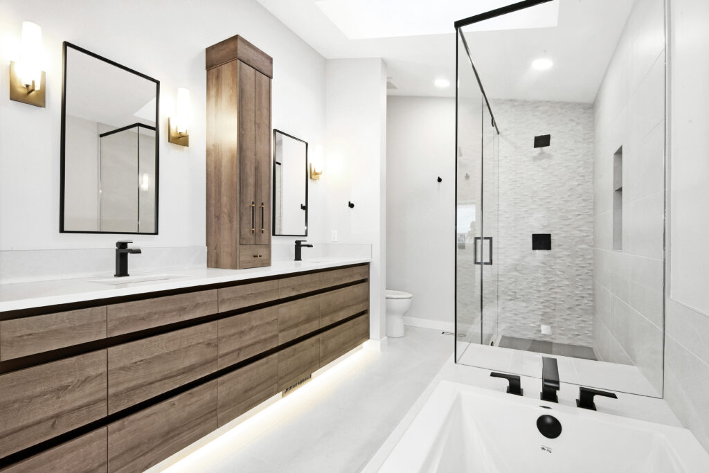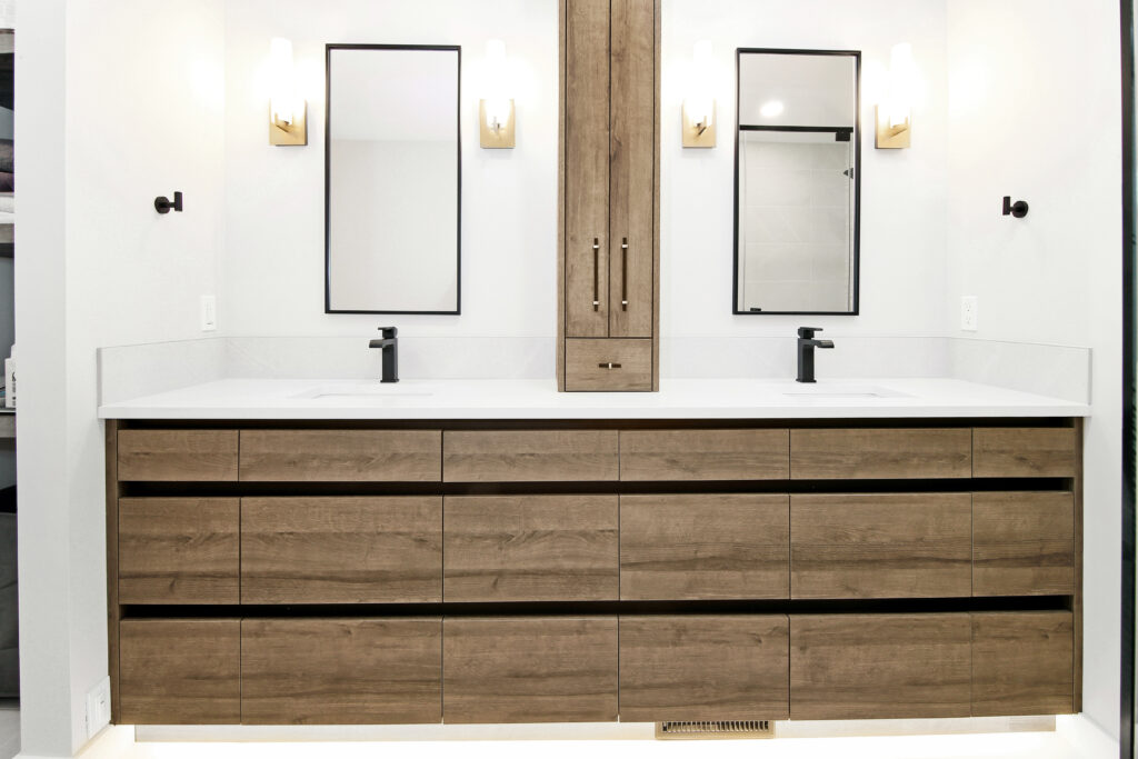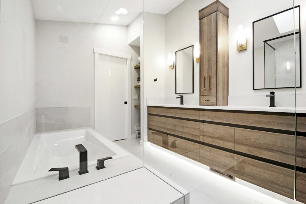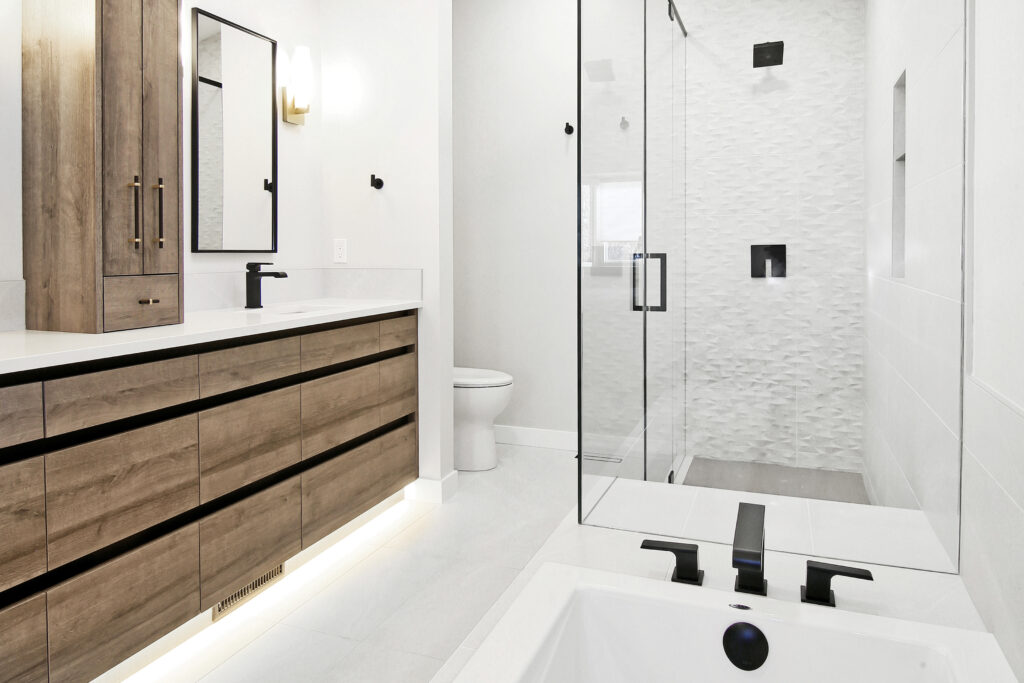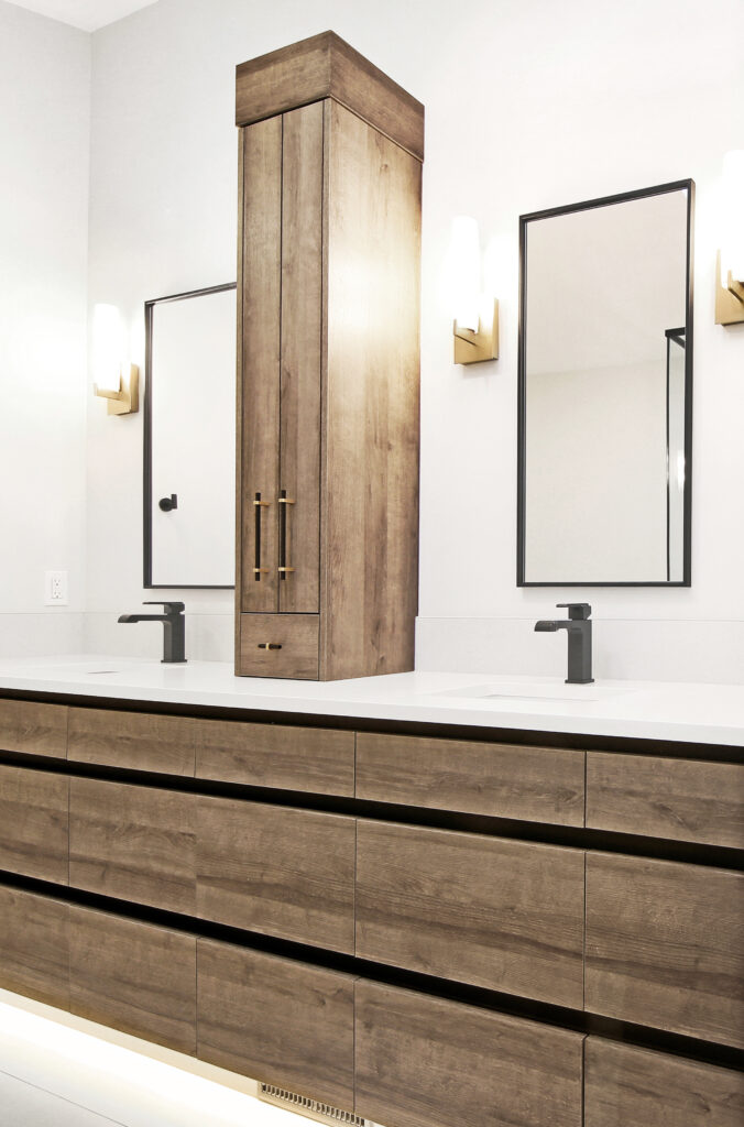 The warm and inviting space is created through a combination of colors and textures that accent the design. The warm horizontal grain and recessed finger pulls on the vanity emphasizes the length of the washroom while providing easy accessible storage. The 3D faceted tile in the shower is accentuated by the natural light streaming through the skylight creating not only a physical texture but a visual one. Keeping the design cohesive are the matte black elements throughout. The black fixtures, finger pulls and mirrors lead your eye through the design from one element to another creating a seamless and contemporary look.