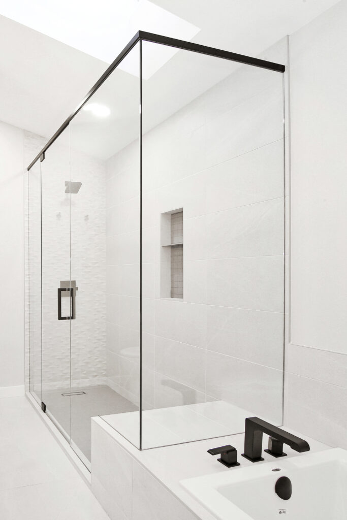 The homeowners goal was to end up with a relaxing space that had enough room for two people to share comfortably and tie in with the rest of their home. Before the renovation, the space was cramped, dark and had all original millwork and trims. By removing the walkthrough closet and expanding the ensuite into that space, we were able to double the footprint of the washroom and create a truly serene space. The combination of different textures and colors emphasizes the design while creating visual interest. Natural light was extremely important to the homeowner, therefore keeping the skylight was a must