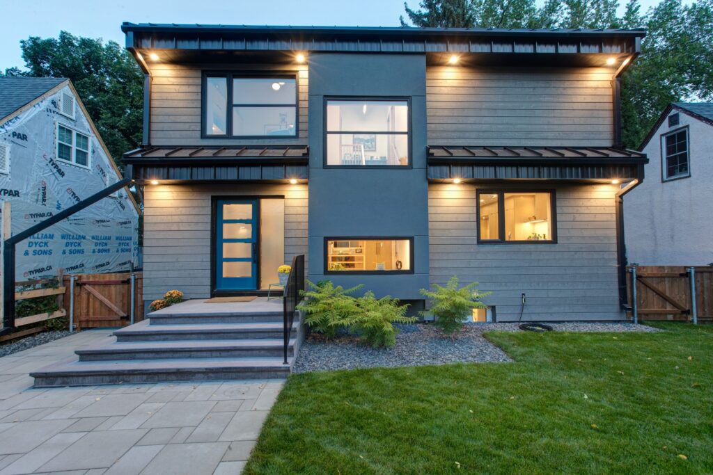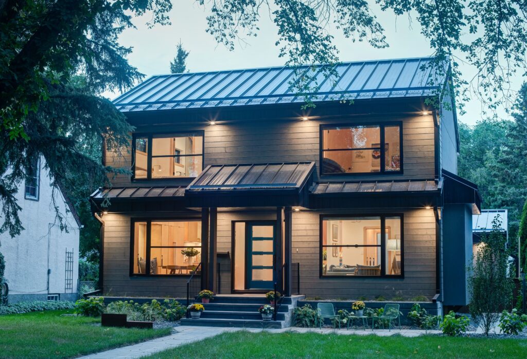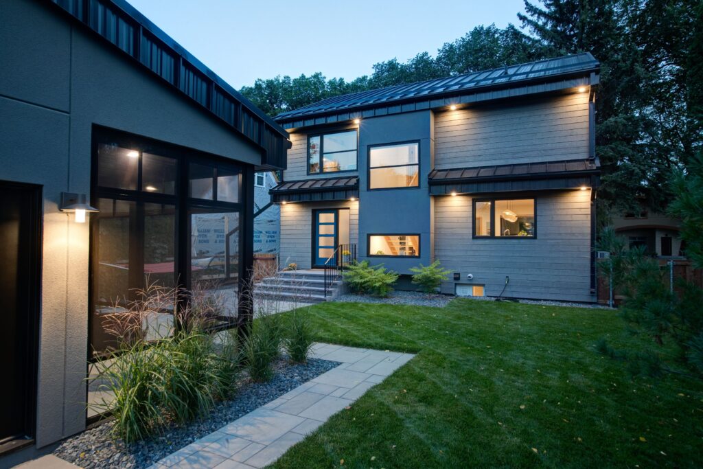 The exterior massing and proportions of the building are inspired by the surrounding neighborhood architecture, yet it presents a completely new look with modern finishes, materials, and detailing. The original storey-and-a-half roof was removed to construct full-height second-floor walls, enhancing the structure’s vertical presence. A sleek standing-seam black metal roof and fascia contribute to its contemporary appearance, while insulation has been relocated to the exterior of all walls and the roof, accompanied by all-new high-performance windows and doors. The approach to the home is marked by new concrete steps leading to a covered front entry, which is supported by striking fir timber posts, blending traditional elements with modern design.