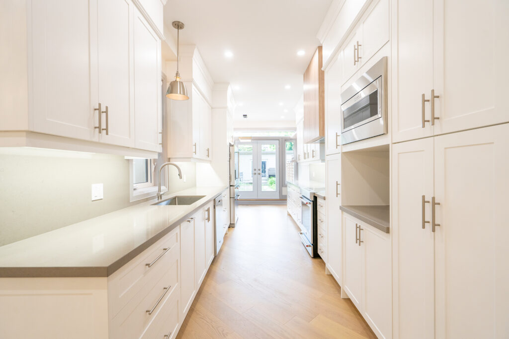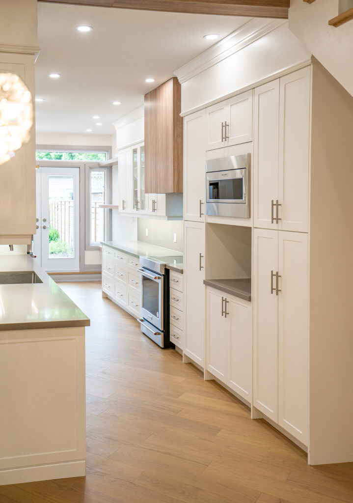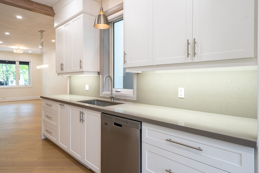 Eliminating the load-bearing wall in the kitchen to create an open floor kitchen extending to a living/dining area gives more space for casual family gatherings. The kitchen space was previously filled with dated appliances and ceramic tile flooring. All appliances were replaced and brought up to date including a built-in microwave. A stunning grey quartz backsplash with matching countertops, built-in bench with storage, white cabinetry and light hardwood flooring now added a complete modern finish to the kitchen. The lighting throughout the home was given a complete face-lift incorporating modern pendants and pot-lights with dimmers. A new glass door was installed for a back entrance and the room became bright and connected with the rest of the main level, capturing sunlight with view a clear outdoor view. Solid light oak wood flooring was sanded, stained, placed at a 45 degree angle gives a modern finish, complementing the white cabinetry.