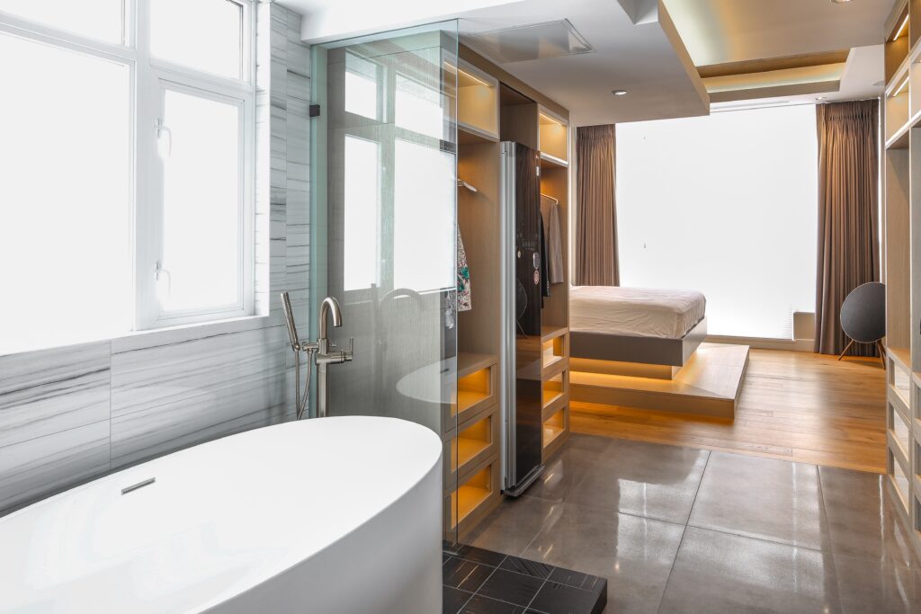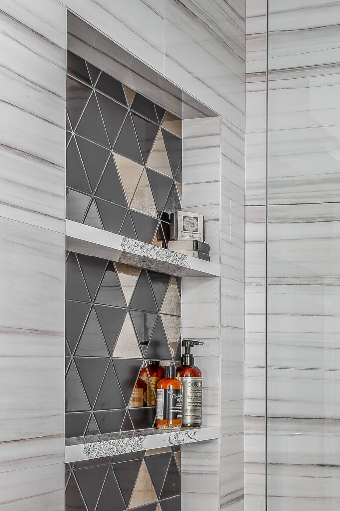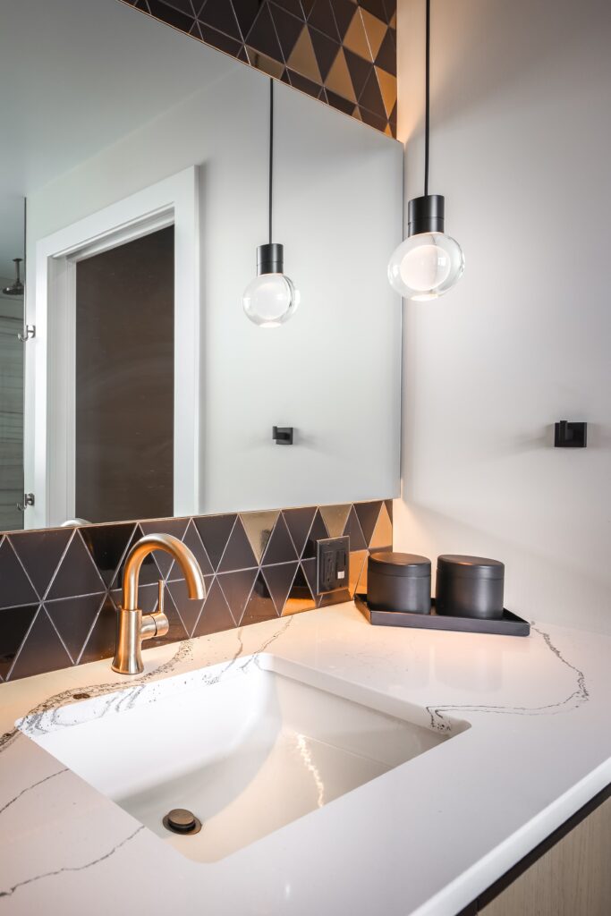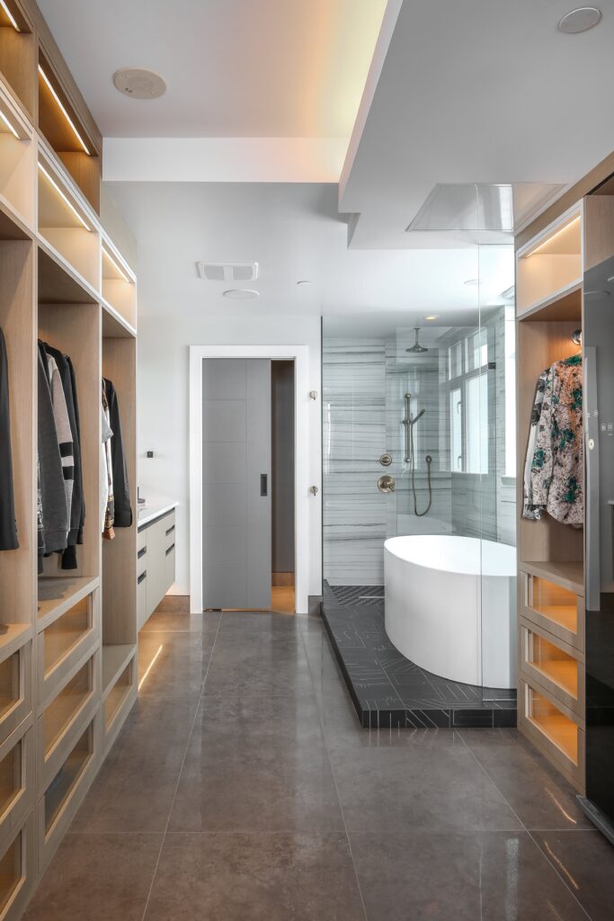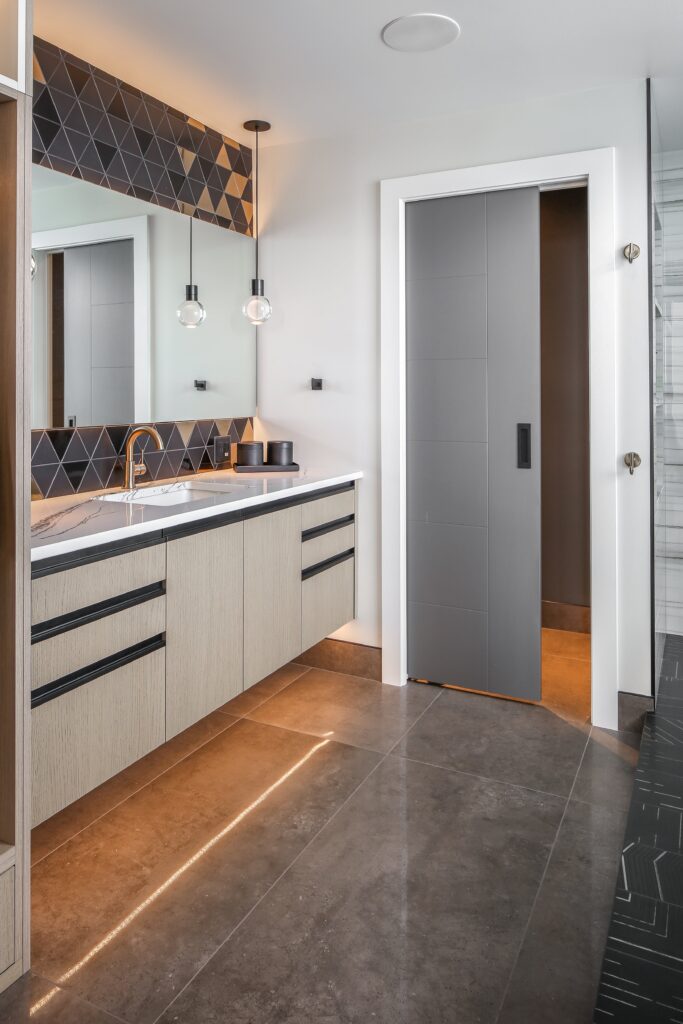 This young bachelor desired an integrated, dramatic, and modern primary ensuite. He wanted it to focus on luxurious finishes, maximizing storage, and optimizing natural light/views.