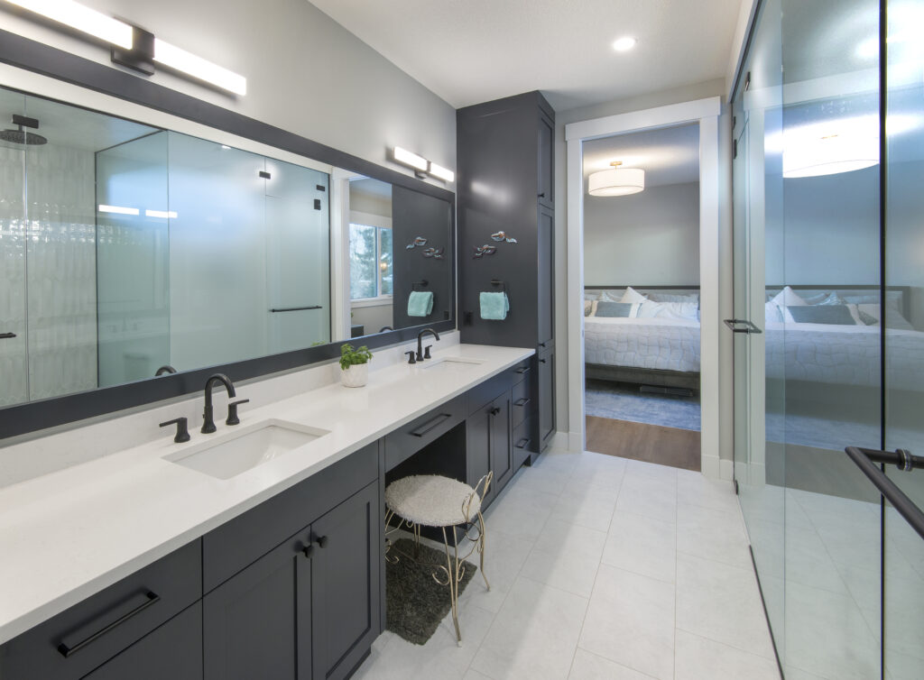 To achieve their dream home, they raised the entire second storey, including the roof, to increase ceiling heights from 8ft to 9ft on the main floor and 7’6” to 9ft on the upper floor. Every interior wall was reframed to allow for a more functional floor plan, with the addition of a third garage bay. The end result was a beautiful home with an open concept living space on the main floor and an ultimate master retreat upstairs. The bedroom led directly to a master en-suite, closet, and laundry room for the ultimate in convenience.