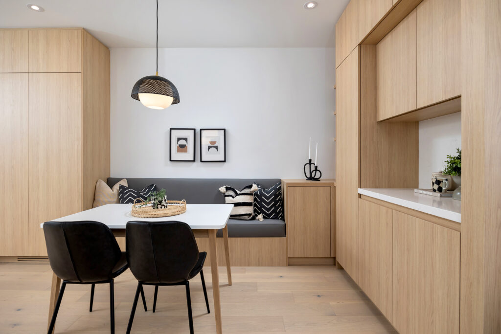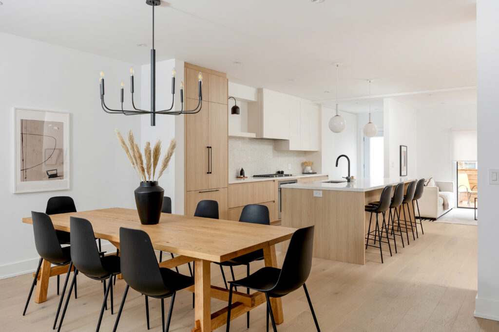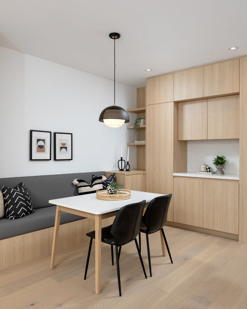 Removing nearly all the walls on the ground floor created an open concept living space. They relocated the kitchen to the centre of the new wall space, merged it with the living and dining room spaces yet clearly defined its functional footprint by adding an island/breakfast bar and then extended it with the addition of banquette seating and a freestanding table on the opposite wall.