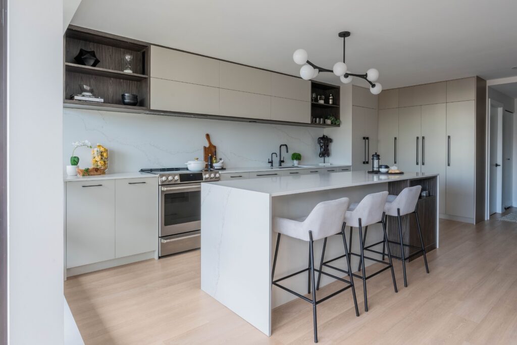 The homeowners decided to renovate their kitchen to better fit their lifestyle as a young couple in the entertainment industry, where hosting events is a frequent occurrence. A central feature of their renovation is the addition of a large island that serves as both a social hub and a functional workspace. They also wanted more storage, improved lighting, and additional electrical outlets to accommodate their modern needs. By concealing appliances, they aimed for a sleek, uncluttered look. Ultimately, this renovation not only enhances their daily living experience and entertaining capabilities but also significantly increases the property’s overall value.