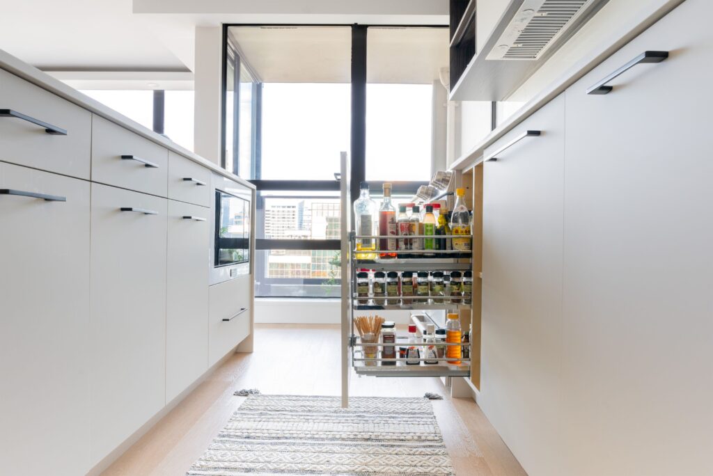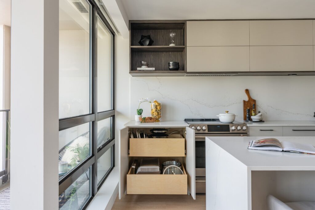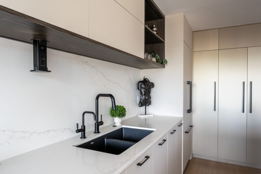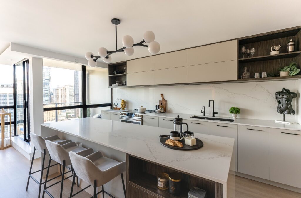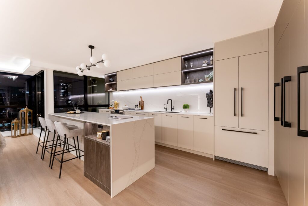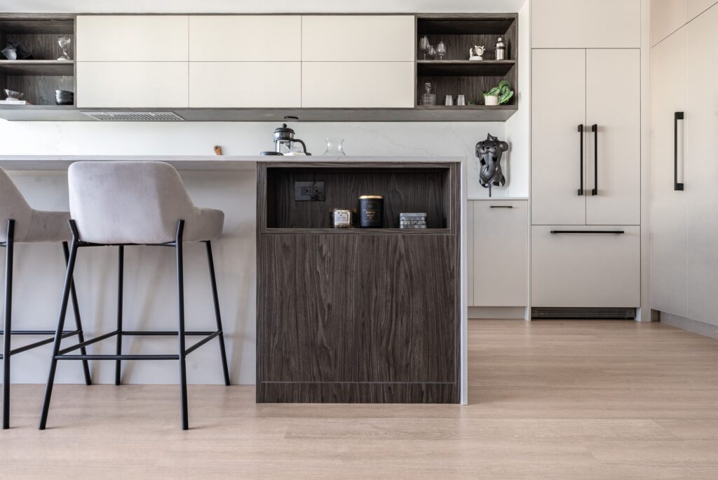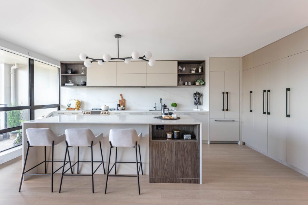 The redesigned kitchen features an open layout with a large island perfect for entertainment and preparing food for children, complemented by plenty of storage, hidden LED lighting, a relocated chandelier, and pop-out counter plugs. The property value has increased for future rental opportunities due to the use of durable, easy-to-clean, allergen-reducing materials, dark wood with light countertops, integrated appliances, waterproof vinyl flooring, and eco-friendly countertops. Internal drawers and millwork accessories, such as lazy Susans, spice racks, and recycle bins, enhance both aesthetics and functionality, while push-open upper millwork and fingerprint-resistant finishes provide a clean look. Updated appliances and insulation boost energy efficiency, and eco-friendly materials, non-toxic adhesives, and sealants improve air quality and natural light. Smart home features, energy-efficient LED lighting, and water-saving fixtures are integrated, with spaces prioritized for meditation and mindfulness. An instant-hot-water faucet allows for quicker cooking. The open kitchen connects seamlessly with the dining, living room, and balcony areas, with a ceiling-height pantry offering additional storage. Despite budget constraints, the use of a local millwork company and budget-friendly appliances and fixtures, along with the hiring of a structural engineer for electrical wiring, ensured the successful redesign focused on functionality and utility.