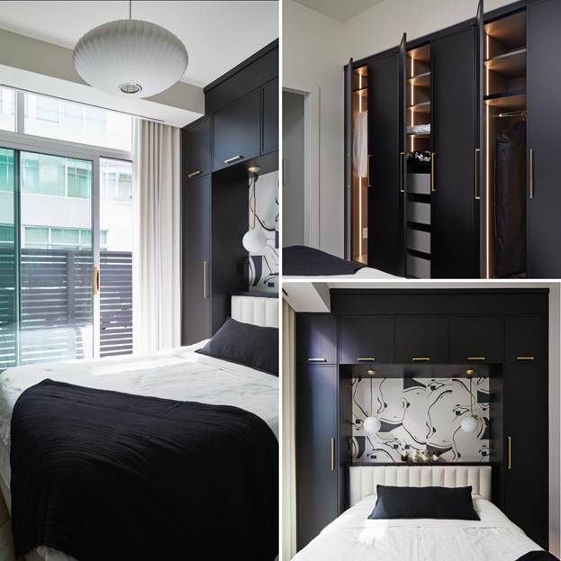 “Condo living is now much smaller by way of square footage than a single-family home…but they often have taller ceilings. We use custom millwork to create storage in the total volume of space. 10-12 and even 14ft ceilings in lofts creates huge opportunities to improve the functionality. Going custom allows it to look really chic – like this project with the staggered and stepped millwork with variation of painted, stained and textured finishes that visually breaks up the total vertical massing.” – Brendan Charters, Eurodale Design + Build